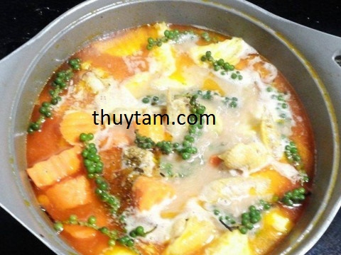 – Thả khoai tây, khoai sọ và cà rốt vào nấu cho nhừ. Sau khi khoai chín cho pate và hồ tiêu muối vào hầm chung. Thêm gia vị cho vừa ăn. Hoà bột năng với 2 thìa nước lạnh cho vào nồi đun thêm 5′ nữa là có thể ăn được.